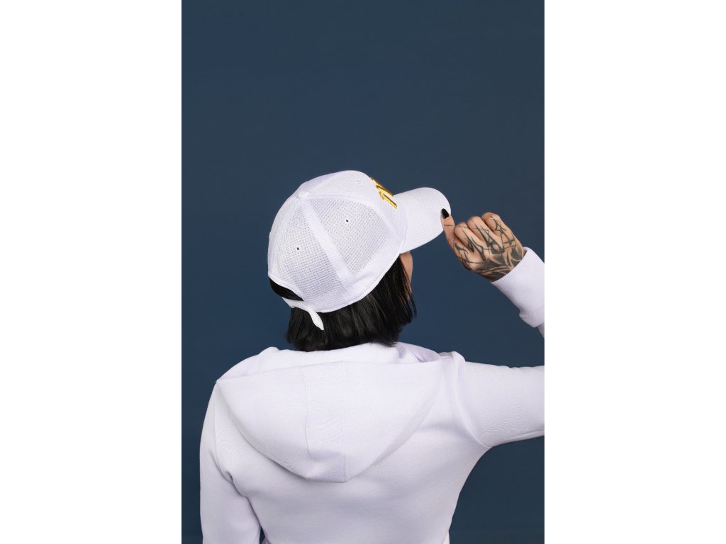 Tato moderní kšiltovka je vyrobena ze 100% elastického polyesteru, který na dotek připomíná bavlnu – příjemný a pohodlný materiál, který drží tvar a zároveň dobře sedí. Má nízký profil, klasicky zahnutý kšilt a měkké, pružné zapínání typu snapback z gumového materiálu, které se pohodlně přizpůsobí každé hlavě.